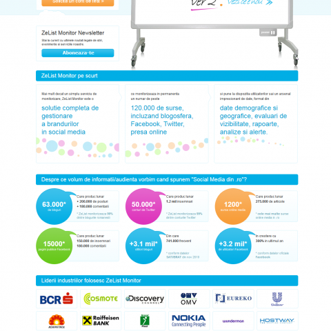 Zelist Monitor este un sistem de monitorizare si masurare a social-media din Romania. In fiecare saptamana Zelist Monitor analizeaza peste 62.000 de bloguri, peste 49.000 de conturi de Twitter, 2.000 grupuri Facebook, 15.000 pagini publice Facebook, 500 de publicatii online si cele mai importante forumuri romanesti pentru a-ti da posibilitatea de a indentifica in timp real principalele discutii create in jurul brandurilor care te intereseaza.